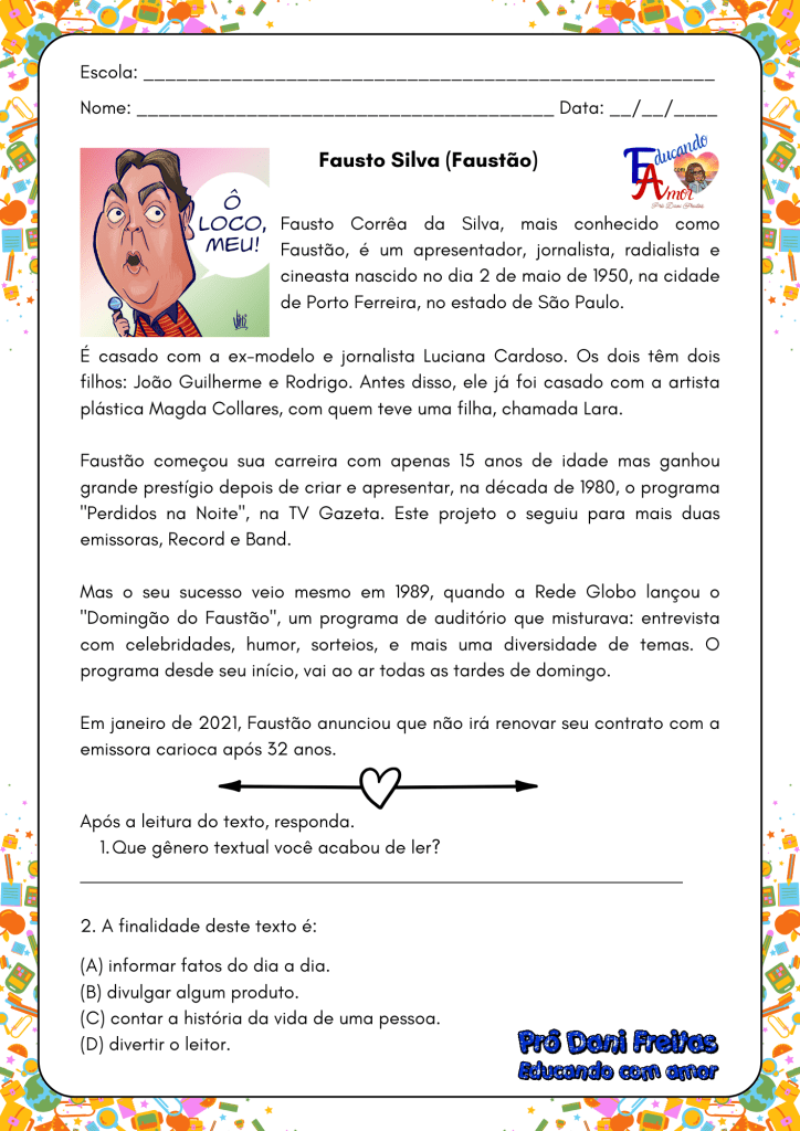 EF35LP06: Ler e compreender, com certa autonomia, textos de diferentes gêneros, identificando suas finalidades e os temas abordados. Ao comparar uma biografia e uma notícia sobre o mesmo personagem, os alunos são desafiados a distinguir o que cada texto busca transmitir, desenvolvendo uma leitura crítica e reflexiva.