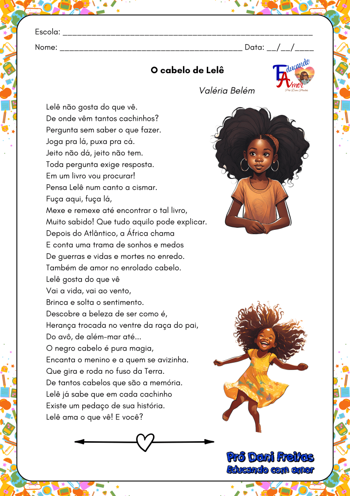 A atividade baseada no texto “O Cabelo de Lelê”, de Valéria Belém, proporciona uma oportunidade valiosa para abordar temas como identidade, ancestralidade, respeito à diversidade e autoestima com os alunos do Ensino Fundamental. Essa prática, além de enriquecer o repertório literário das crianças, contribui para a valorização das histórias e culturas africanas e afro-brasileiras, promovendo uma educação antirracista e inclusiva.